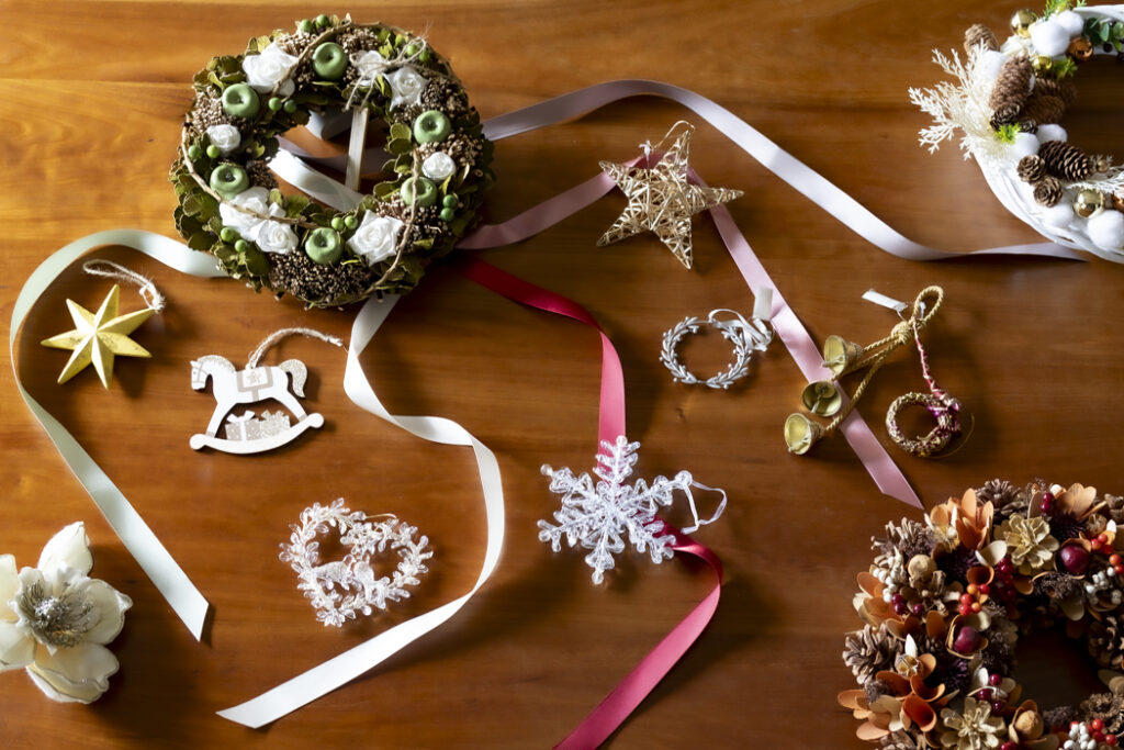 リボンやワイヤーで仕上げる「オリジナルリース作り」を