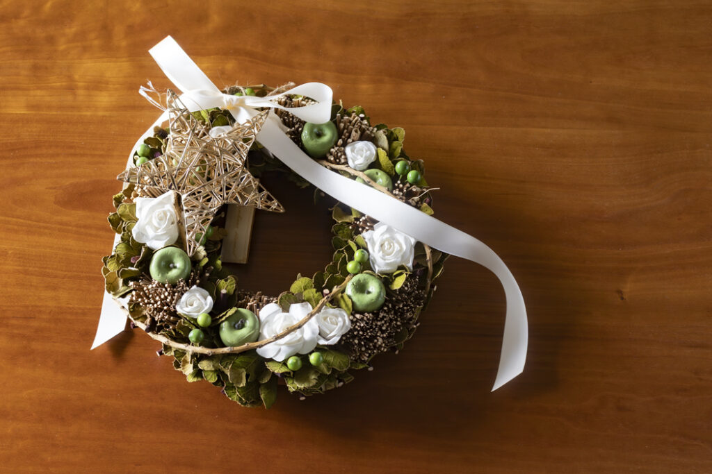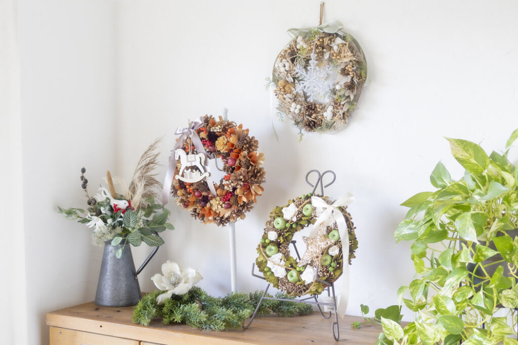 出来上がったリースは、玄関の扉やお部屋の壁、スタンドを使って棚の上など